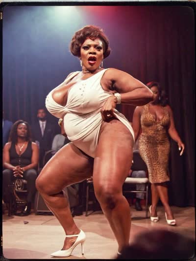The four women both ifts up their dress up to her hips then begins crouching