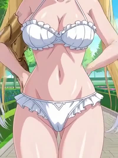 Takes off her shirt, and then her skirt, white frilled panties, thigh gap