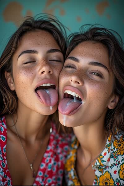 Bring the image to life, the two beautiful women kiss while cum drips between