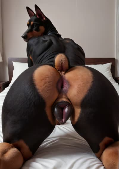 Dobermann girl, anthro furry, indoor, back view, canine spade, exposing ass