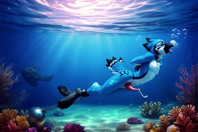 A 2d animation, completely underwater, a male anthro blue jay is bound