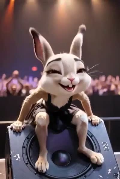 Judy Hopps from Zootopia in a white skirt and crop top that says "Happy