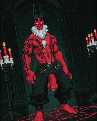 A demon with red skin and a long white beard is standing on a pentagram