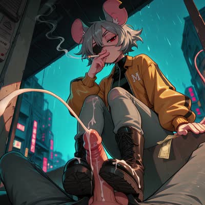 A mouse woman wearing an eyepatch moans as she rubs her pussy in a circular