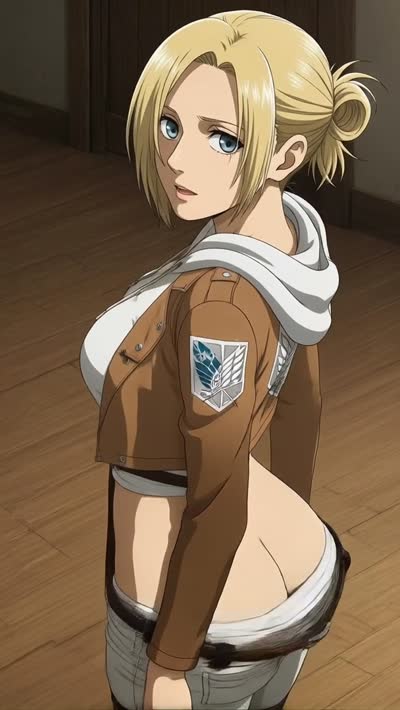 A sexy 2d anime blond girl with blue eyes and pale skin wearing brown jacket