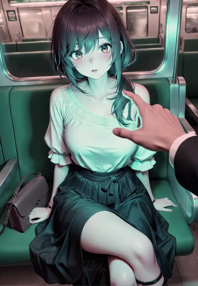 2D 애니메이션 스타일, 지하철 안 여자는 의자에 앉아 의심스러운 눈으로 화면을 바라보며