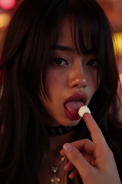 The woman is sucking on a penis, the penis thrusts in and out of her mouth