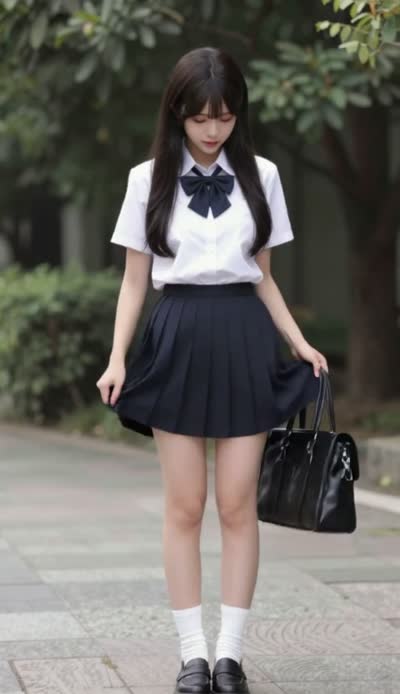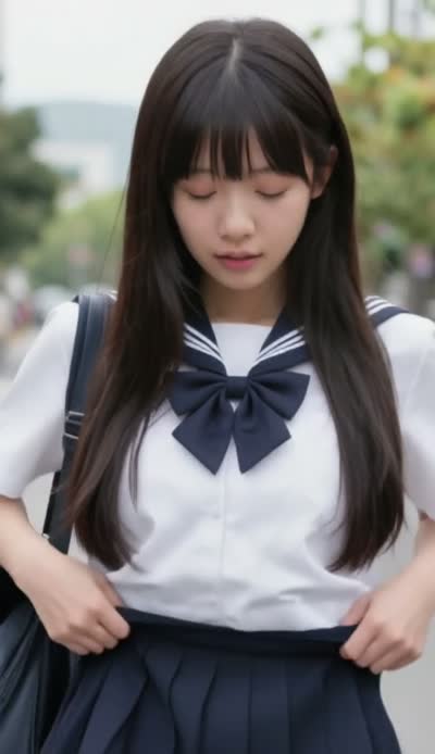 The girl lifts her skirt and squat down, spreads her legs then pisses