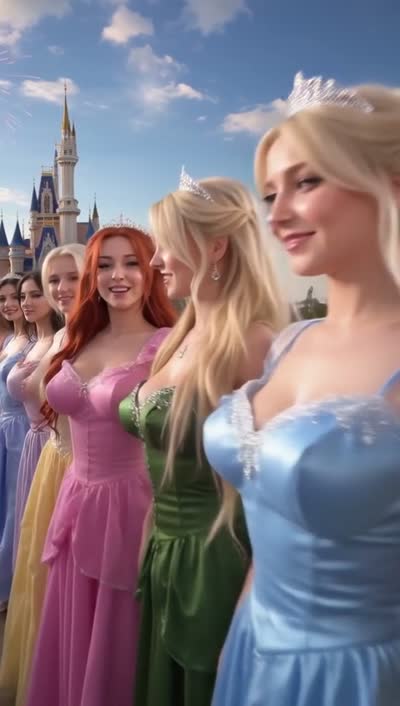 A group of gorgeous young classic Disney Princesses in ballgowns