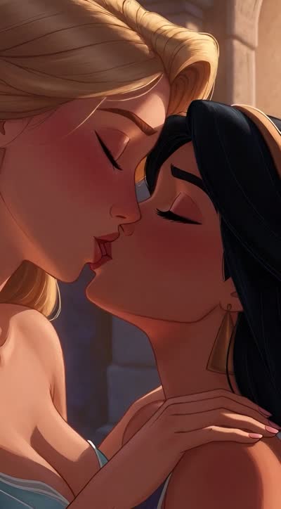 Passionate kissing, The camera focuses on rapunzel as she kisses Jasmine’s neck