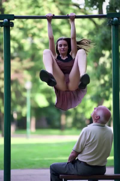 The woman spreads her legs, Her vagina exposed, The old man gazes at her